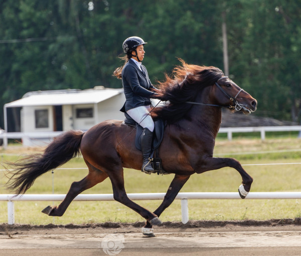 Father Loki frá Selfossi - Honour price for offsprings, 8,21 for exteriour and 8,58 in riding with 4x9,5 and 1x9 in it, total 8,43. Multiple-time Landsmót champion, most notably winning the B-class in 2014 with an outstanding score of 9.39.