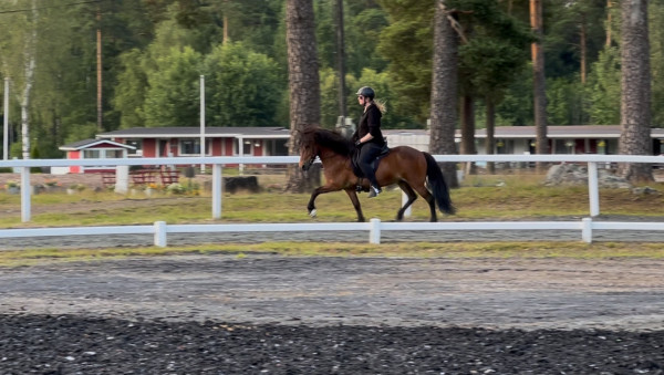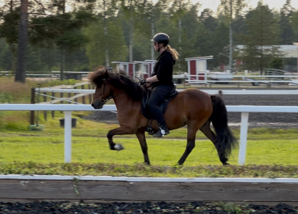 Fantastiskt roligt sto, med mycket tölt och stora röresler i alla gångarter. Trygg att rida, även om hon är väldigt grön så är det bara att rida rakt ut i skogen på nya vägar och hon bryr sig inte alls.