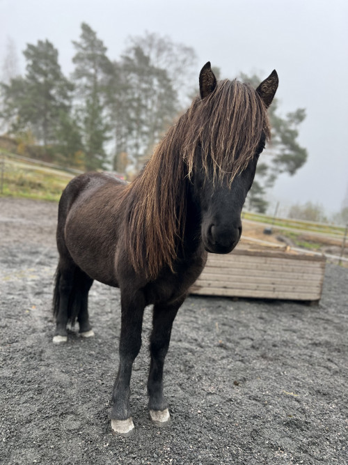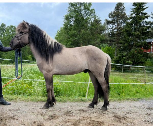 Min första uppfödning. Känslig och nyfiken men orädd och trevlig. Extremt positiv och enkel i allt, har lovande gångarter med elastisk tölt och säker trav. Väldigt ridbar, lättlärd och känslig att rida. Visad exteriört som femåring till 7,81 med 8 på huvud, hals manke bog, proportioner och hovar.